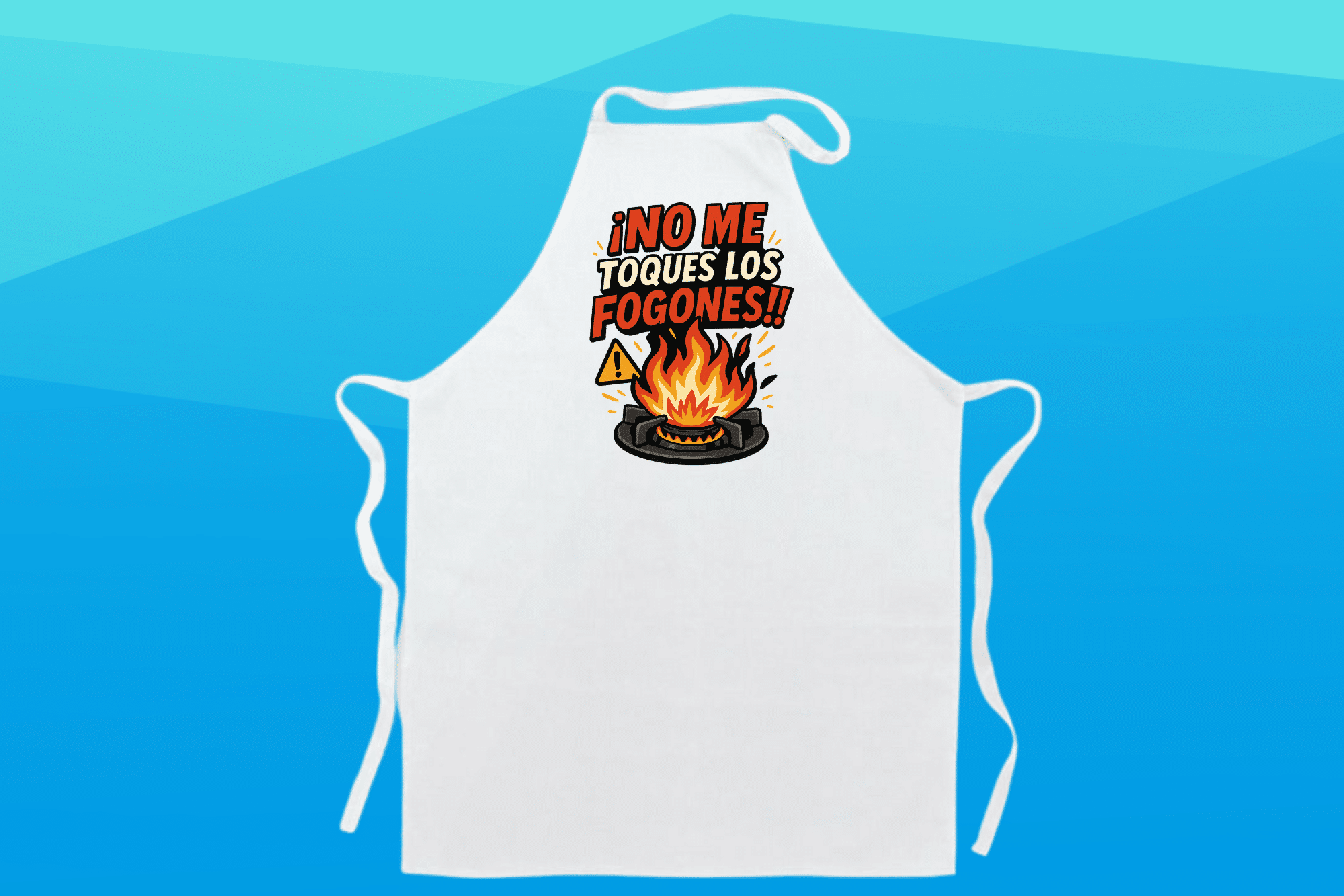 Delantal con mensaje «Dueño de los fogones». Confeccionado en tela resistente, cómodo y práctico para usar en cocina o barbacoa. Diseño original que saca sonrisas. Ideal para regalar o darte un capricho.