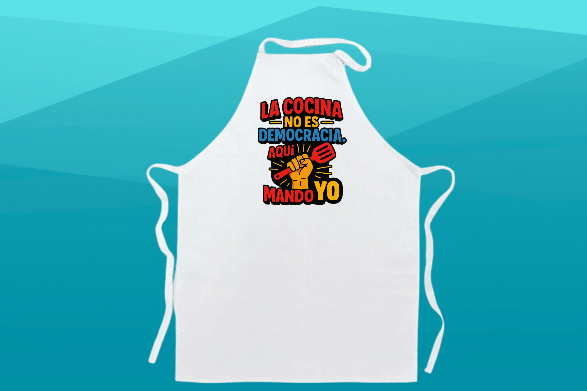 Delantal con mensaje «Hoy mando yo». Confeccionado en tela resistente, cómodo y práctico para usar en cocina o barbacoa. Diseño original que saca sonrisas. Ideal para regalar o darte un capricho.