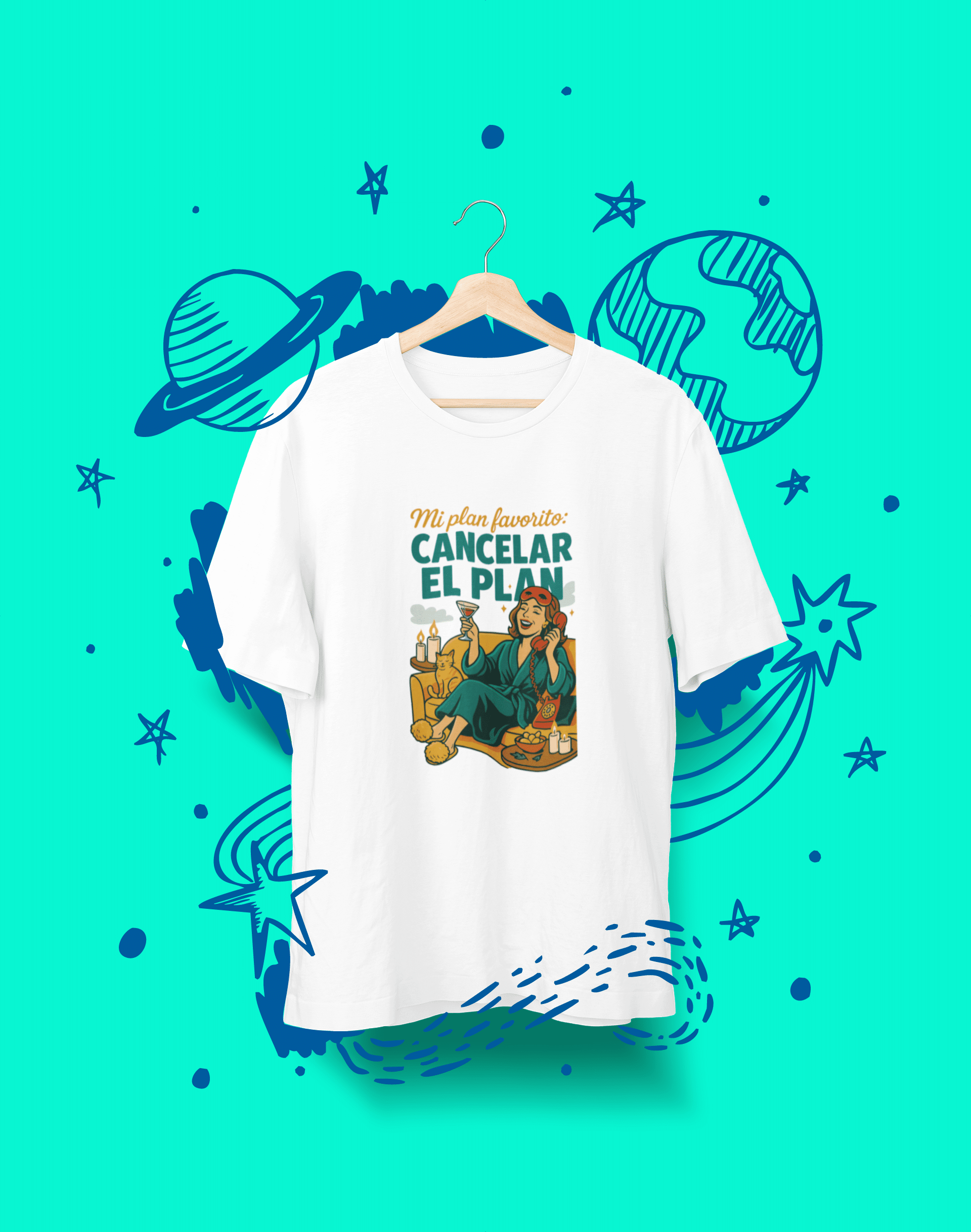 La camiseta con el mensaje ‘Mi plan favorito: cancelar el plan’ es perfecta para quienes viven a su ritmo. Algodón suave, corte unisex y mensaje directo. Ideal para regalar(te) y marcar estilo sin complicarte. Disponible en varias tallas. ¡Exprésate sin decir una palabra!