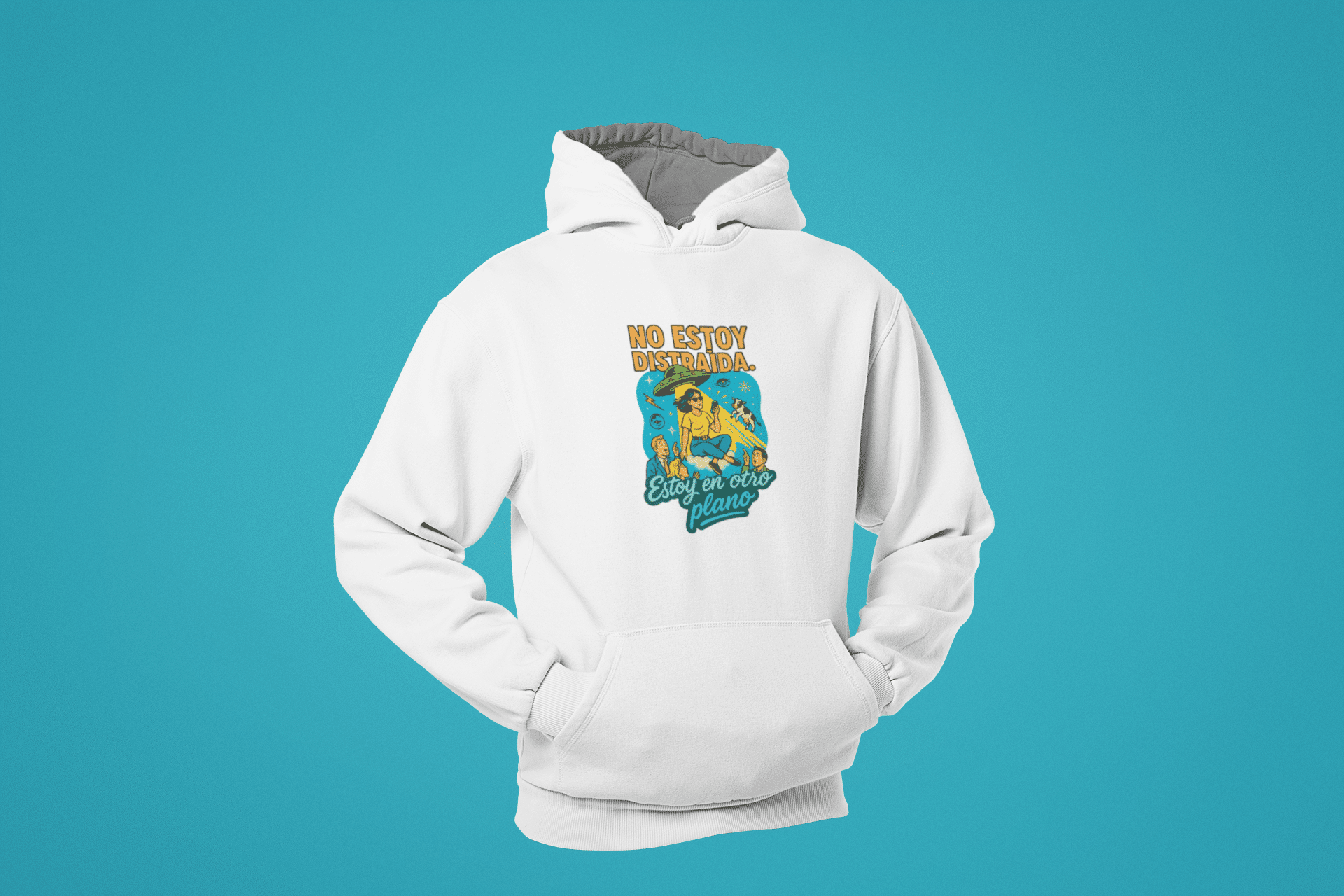 Sudadera de algodón suave con capucha y mensaje potente: «NO ESTOY DISTRAIDA. Estoy en otro plano». Corte unisex, cómoda y perfecta para quienes no se callan nada. Ideal para destacar tu personalidad con estilo.