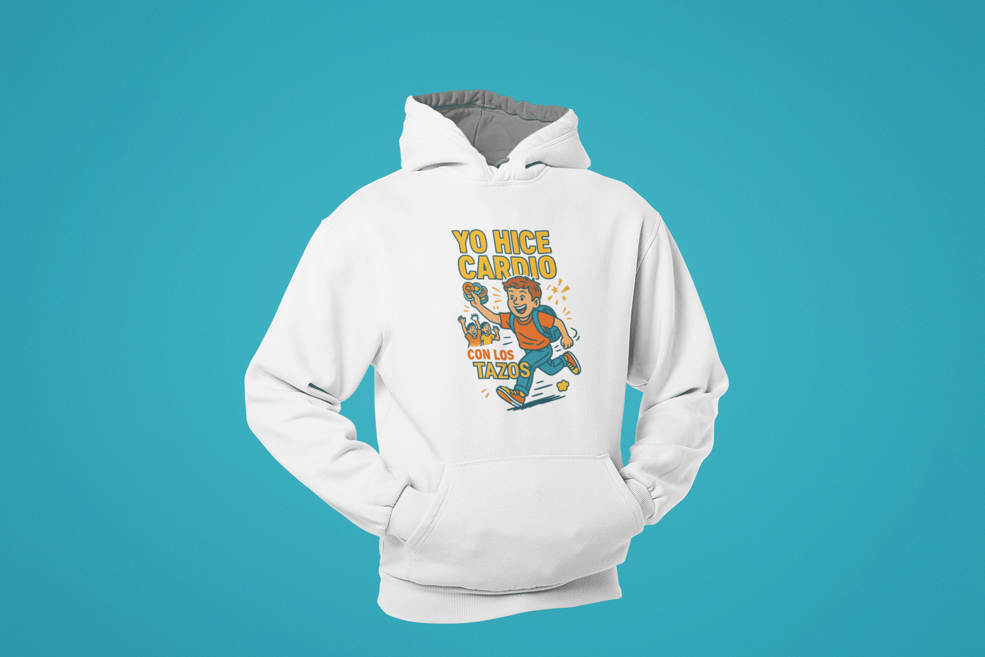 Sudadera con mensaje nostálgico: Yo hice cardio con tazos. Perfecta para quienes crecieron con lo mejor de los 80 y 90. Cómoda, divertida y con mucho estilo.