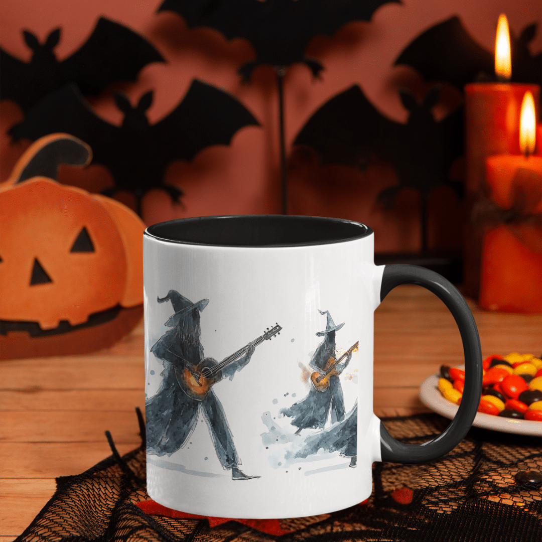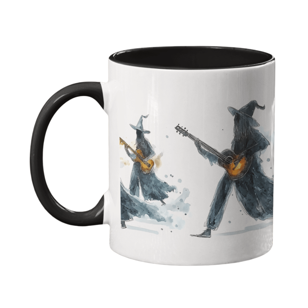 Taza bicolor con interior negro y diseño artístico de brujos tocando la guitarra. Alternativa, mágica y con aire rockero.
