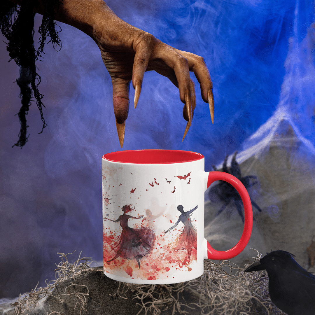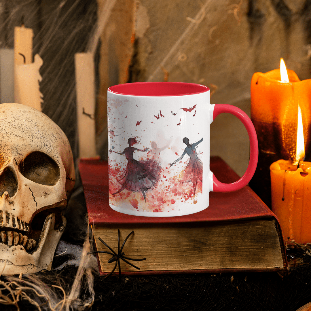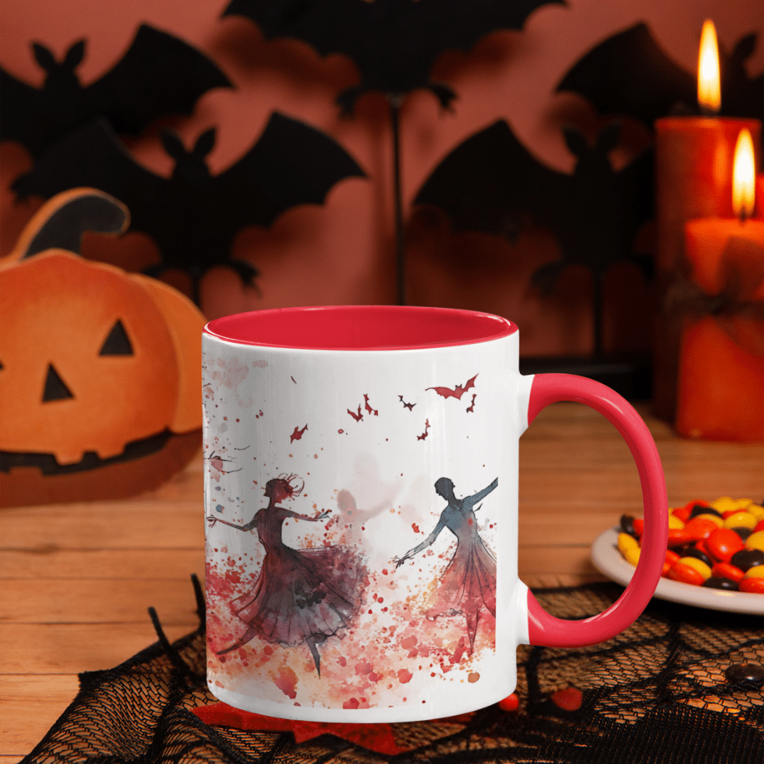 Taza bicolor con interior rojo y diseño artístico de siluetas danzantes rodeadas de murciélagos. Misteriosa, elegante y perfecta para Halloween.