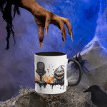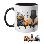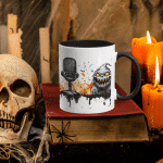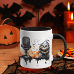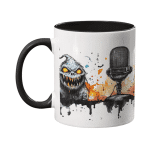 Taza bicolor con interior negro y diseño de monstruo aterrador junto a un micrófono. Oscura, original y con aire rockero para Halloween.