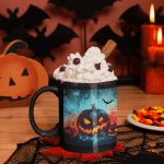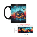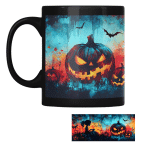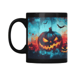 Taza negra de cerámica con calabazas iluminadas y un diseño vibrante en tonos azul y rojo, perfecta para los amantes de Halloween.