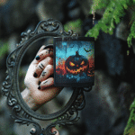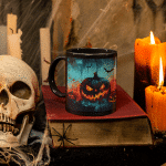 La Taza Negra Pato Blue Calabaza Terrorífica Halloween es una pieza con personalidad, pensada para quienes disfrutan del misterio y lo visualmente impactante. En ella destacan calabazas talladas con sonrisas diabólicas que brillan entre un cielo azul intenso y destellos rojizos, acompañadas de murciélagos que refuerzan la atmósfera de Halloween.