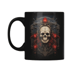 Taza negra con diseño de calavera barroca rodeada de ornamentos y luces rojas. Un estilo elegante y oscuro que no pasa desapercibido.