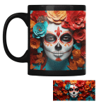 Taza negra con diseño de catrina multicolor rodeada de flores rojas, naranjas y azules. Un homenaje vibrante al Día de Muertos.
