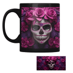 Taza negra con diseño de catrina en tonos rosas y morados. Una pieza vibrante inspirada en el Día de Muertos, perfecta para regalar o coleccionar.
