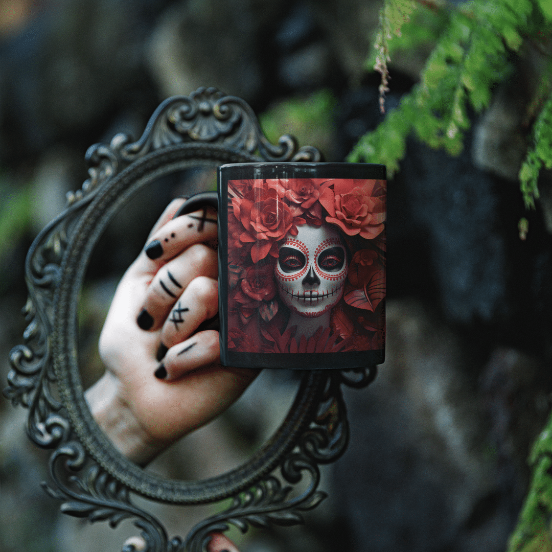Taza negra con diseño de calavera mexicana rodeada de flores rojas. Inspirada en el Día de Muertos, combina tradición y estilo en cada sorbo.