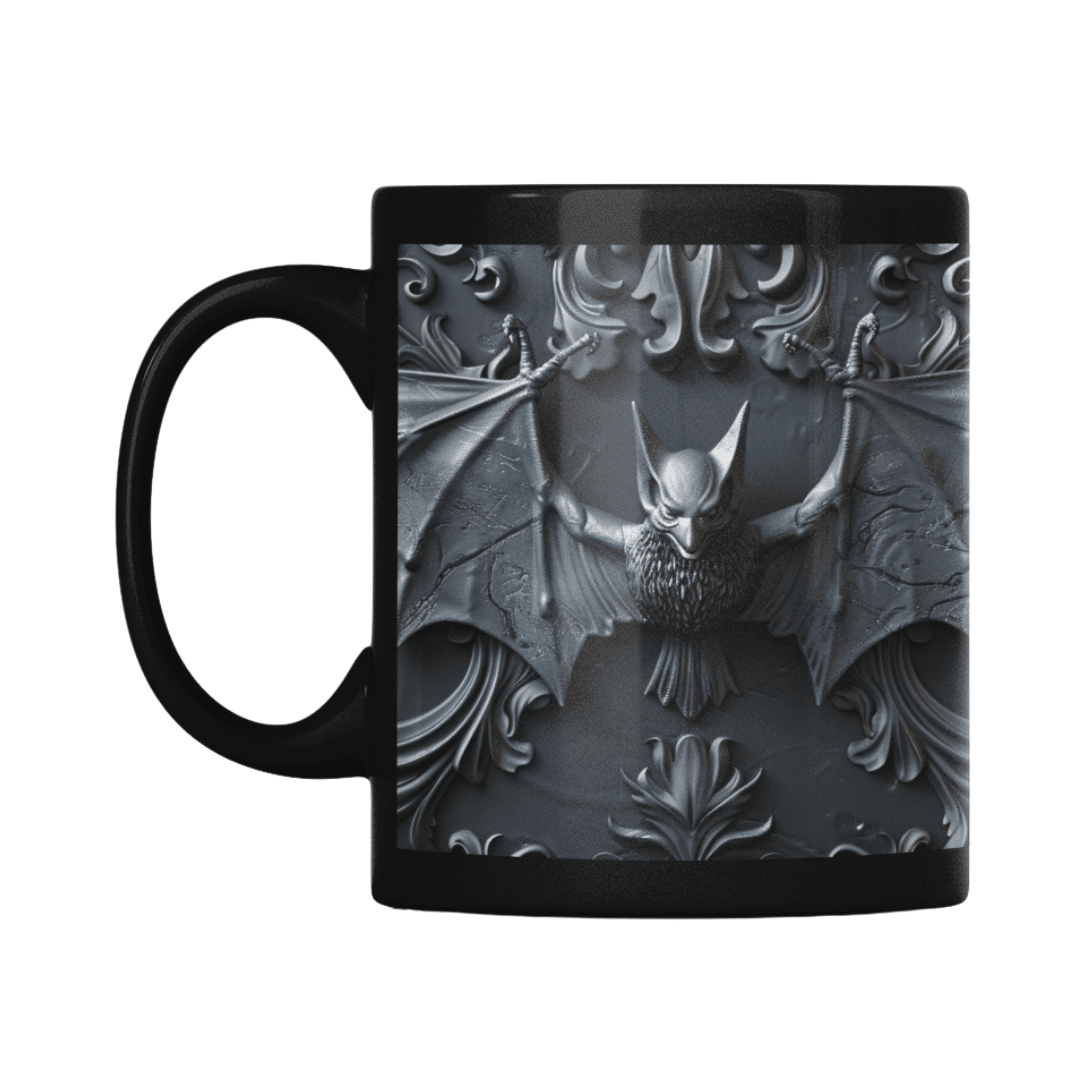 Taza negra con diseño de murciélago gótico en relieve. Un estilo oscuro y elegante para coleccionistas y amantes de lo alternativo.