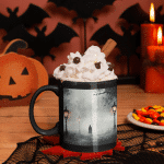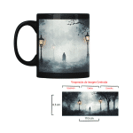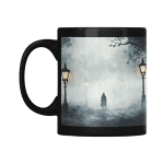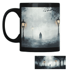 La Taza Negra Pato Blue Niebla de Medianoche captura ese instante en el que la noche se mezcla con la incertidumbre. Entre faroles encendidos y caminos cubiertos de neblina, una figura camina hacia lo desconocido, evocando historias góticas, paseos por Londres victoriano o películas de suspense.