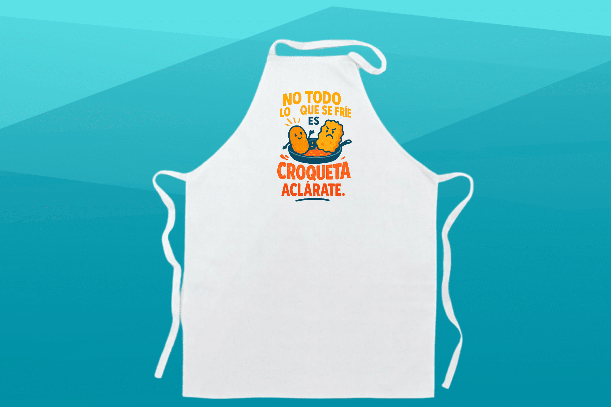 Delantal con mensaje «Todo mejora con croquetas». Confeccionado en tela resistente, cómodo y práctico para usar en cocina o barbacoa. Diseño original que saca sonrisas. Ideal para regalar o darte un capricho.