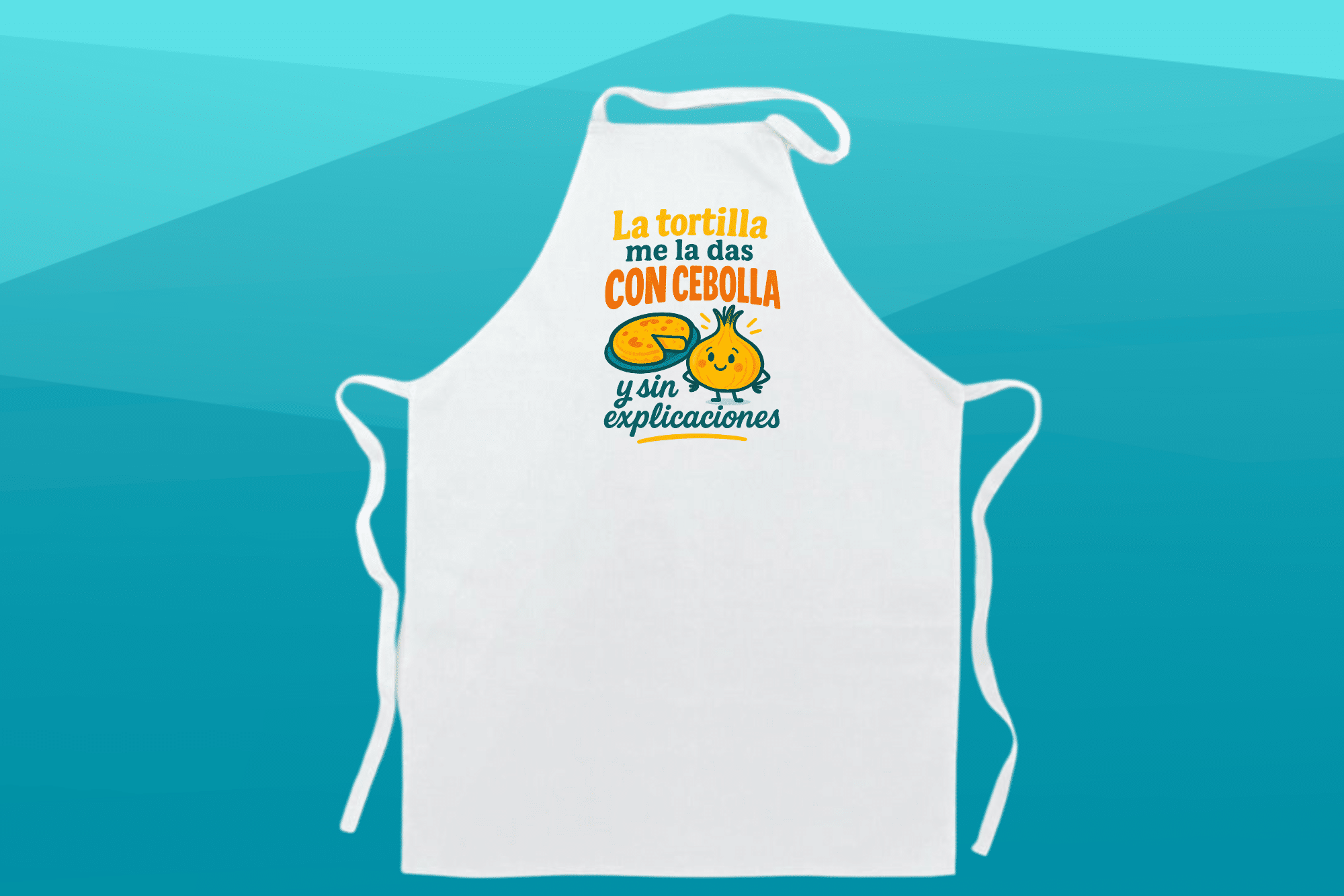 La tortilla como a ti te gusta y punto. Delantal para cocineros que no negocian con sus gustos. Práctico, original y con mensaje.
